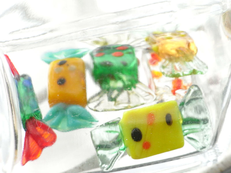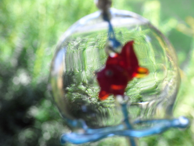 瓶の中のガラス細工にピントを合わせて撮影した。瓶越しに撮影すると瓶のわん曲で中のものが歪んで見えるため、不思議な作品に仕上がる。