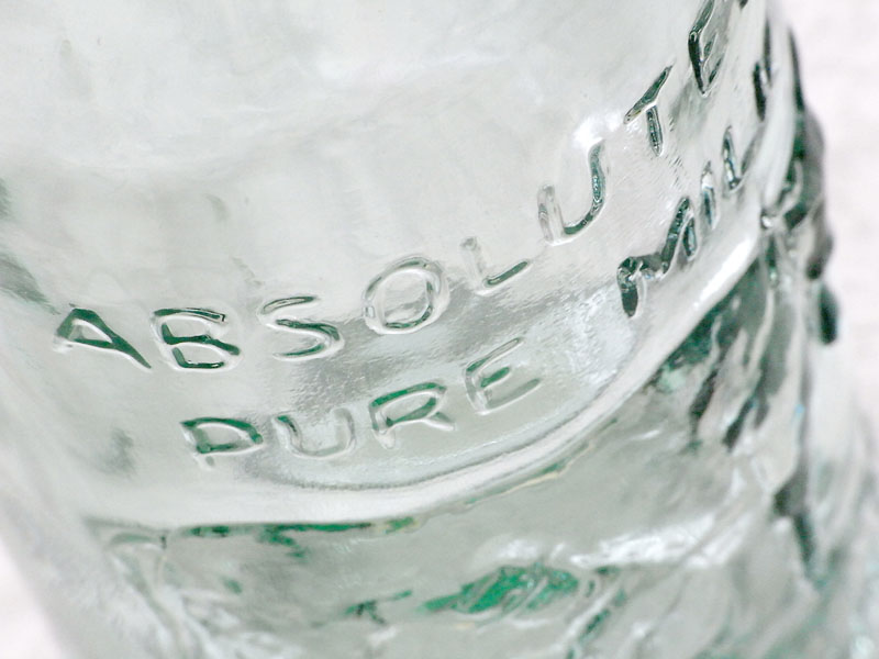 下に白い紙を敷いたガラス瓶を逆光で撮影した。逆光で撮影することで、ビンの凹凸や文字に陰影ができ、立体感が表現できる。また下に敷いた白いテーブルクロスが光を反射して、ガラスの透明感を際立たせている。
