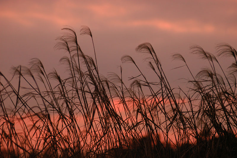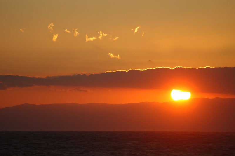 夕暮れの写真の撮影時はホワイトバランスを太陽光に設定する。オートのままだと、カメラが夕日の色を消してしまう。この写真では太陽を少し右に寄せて、近くに浮いていた小さなちぎれ雲を左に入れて撮った。