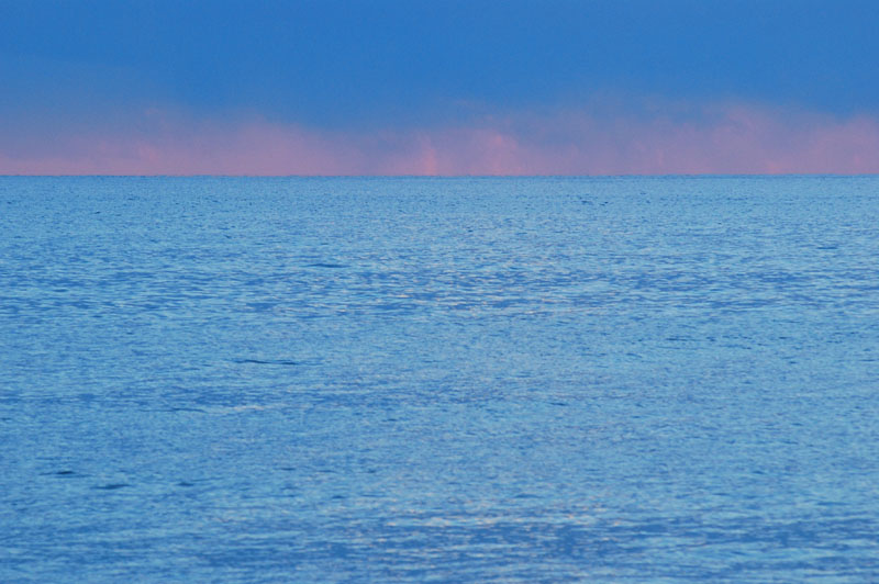 雲が多くて夕焼けらしい色といえば水平線すれすれに細かくできた雲の切れ間くらいしかなかった。この雲の切れ間と海に映り込んだ空の青い色を不思議な感じで表現したかったので、海に映った青い色のスペースを多くとり、水平線上の夕焼け色を望遠レンズで切り取った。