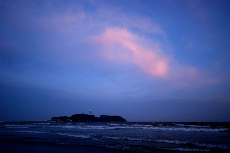 島の斜め上に浮かんだ雲がきれいに色づいた瞬間を撮影。この雲は南東の空に浮かんでいた。夕焼けがきれいだと西の空ばかり見てしまうが、このように濃い青に暮れなずんだ空に色づいた雲という構図は、残照の残っている西の空ではなかなか見られない、夕暮れ後の微妙な空の変化も見逃さないようにしよう。