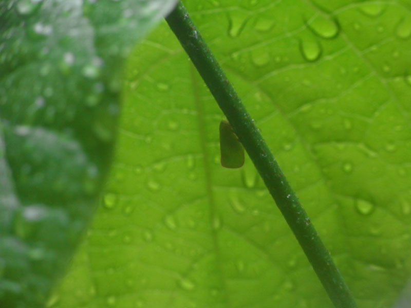 光と影のコントラストが、水滴をより引き立たせる効果を生み出す。この写真は背後に山が迫った場所で、背の高い木に囲まれた庭で撮った。木立に囲まれたスペースで上からしか光が来ないところで、葉を下から見上げると水滴が透けて見える。