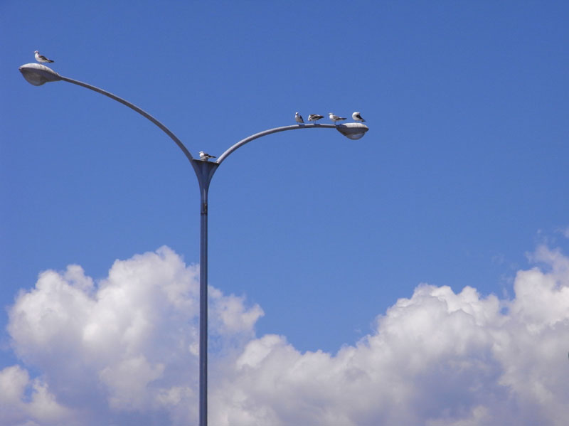 鳥がとまった街燈を切れない程度に画面左に入れて青い空と白い雲を入れた。雲は波型の曲線を描いた部分を画面下にフレーミングした。雲、鳥、飛行機などを一緒に撮影すると、空の大きさやスケール感が表現される。雲だけを撮影する場合は、インパクトのある形を選ぶとよい。ただし、たくさんの要素をいれてしまうのはNG。いらないものは排除した、シンプルな構図の方が印象に残りやすくなる。