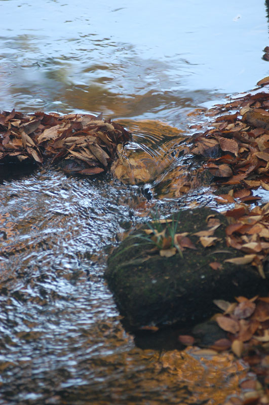 曇り空の白い映り込みと石に引っかかった落ち葉を絡めて撮る