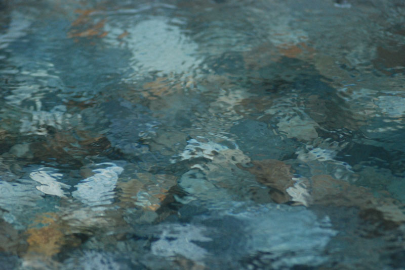 川底にいろいろな色の石が沈んでいるところを撮りたかったので、水面に反射のない場所を探した。透明度の高い水で対岸に黒いものがあるところなどは、その黒が水に映り込んで水面に反射がないので水底を写すことができる。