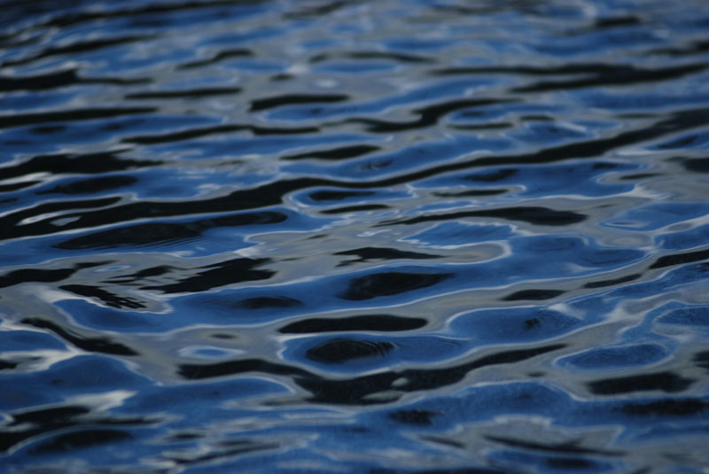 水面にできる映り込みのパターンは水の動きと、対岸にあるものによって決まる。このとき対岸には黒い山陰と暮れかかった濃い青のグラデーションがかかった空があった。このような映り込みのパターンを撮るには、水面に対して斜めの角度から望遠んで一部分を切り取るように撮る。