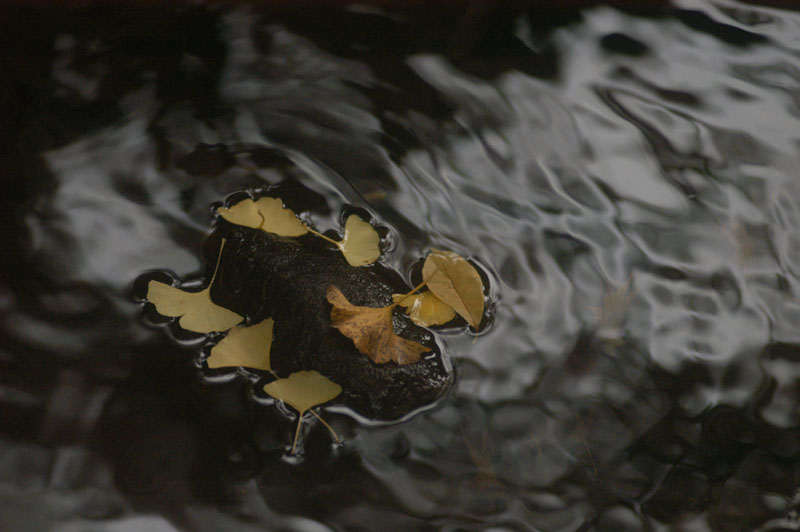 お寺の境内の中の小さな流れ。暗い場所なので、ほどよく水面がブレて水の静かな揺らぎが表現できた。石に引っかかった落ち葉をポイントにするため、画面中央よりやや左に寄せてフレーミングし、水の揺らぎを入れるスペースを作ってフレーミングした。