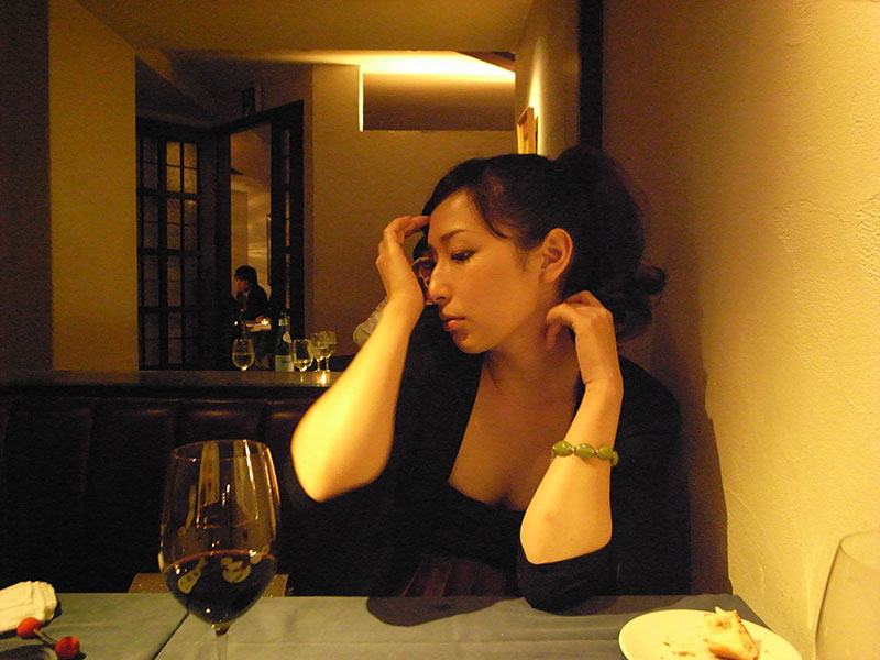 レストランでの食事中、ふと髪をかき上げた瞬間を切り取った一枚。間接照明のやわらかな光で自然な表情を撮影した。