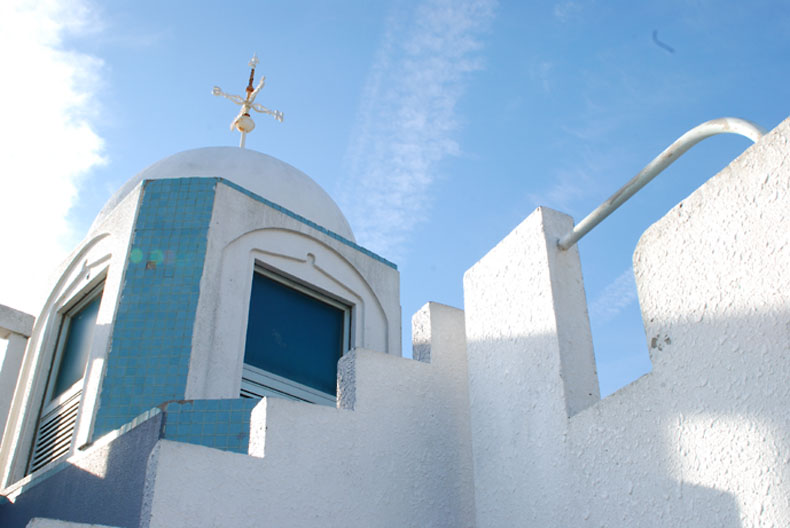 街灯を見上げるように撮影し、空を背景にした。空の青さが、街灯の形を際立たせている。また、画面中央に街灯を、白い柵を斜めに配置したことも構図のアクセントになっている。