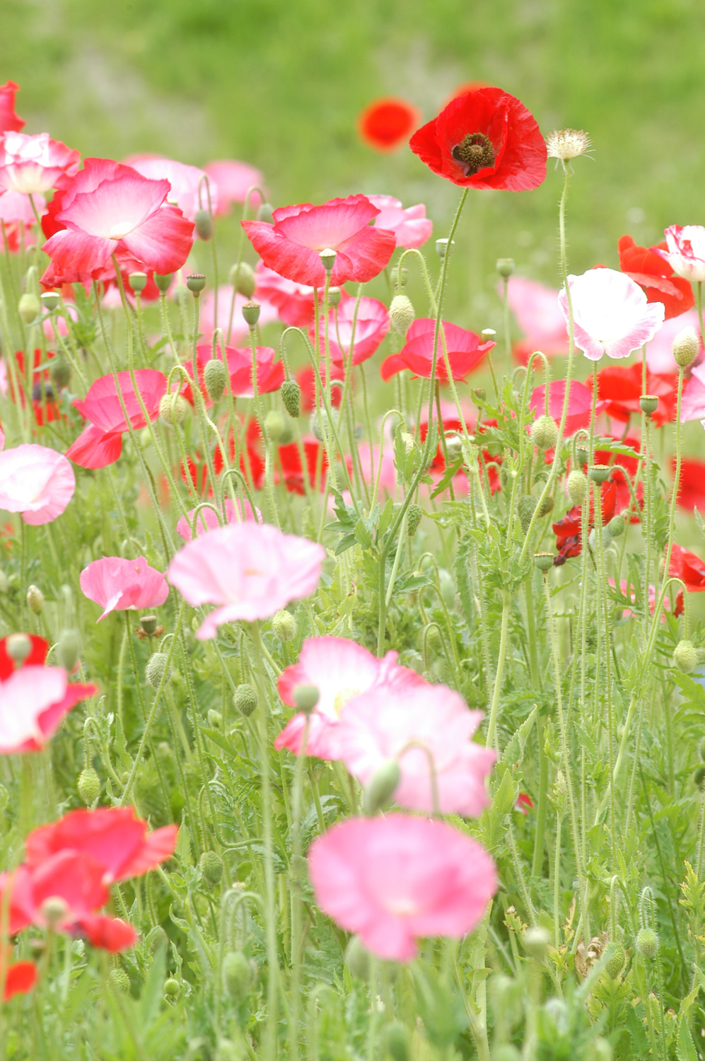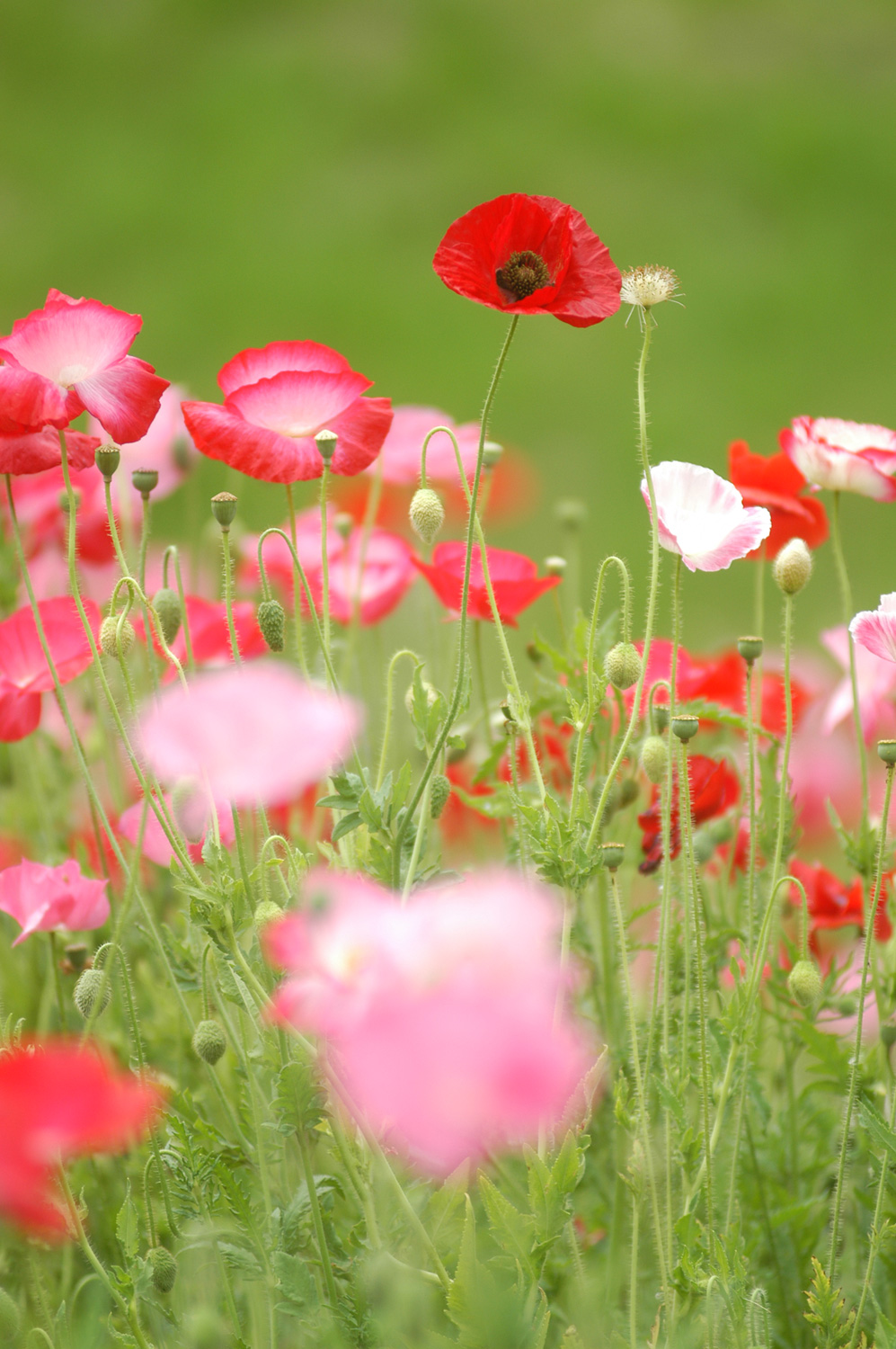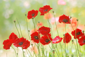 写真全体を明るい色でまとめると明るくさわやかな印象になります。では「全体を明るくってどうすればいいの?」でしょうか。まずは明るい背景を選ぶことです。この写真の場合主役は群生する赤いポピーです。だから露出(明るさ)はこの赤いポピーにあわせて撮るわけです。でも画面の大部分の面積を占めるのは主役よりも背景ですから背景がくら~い状態では写真全体が暗いイメージになってしまいます。そこでこのときは明るい緑が背景になるように主役の花をフレーミングしながら左右に動いて明るい背景をさがしました。