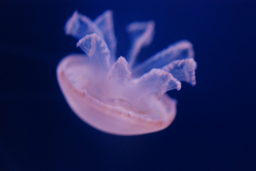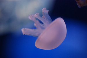 山岡の場合、海月は水族館に行ったときは必ず撮ります。半透明な体にライトの光が透けて神秘的なイメージの写真が撮れるので水族館に来たときはしばらく海月の水槽の前ですごします。たいていの海月の展示は海月がきれいに見えるようにライティングが工夫されています。暗い水槽内で海月に半逆光くらいのライトが当たるようになっていることが多いようです。