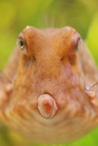 作例(3)はハコフグを正面から撮りました。魚というと、横から見たときのイメージを思い浮かべる人がほとんどだと思いますが、正面から見ると以外にユーモラスな顔を発見できることがあります。この大きさで撮るにはマクロレンズが必要です。F3.3ですが明るい水槽だったのでぶれずに撮ることができました。