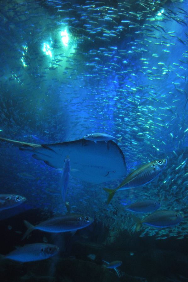 作例(4)は広角で大水槽を撮ったカットです。ポイントは大きなエイと鰯の群れ、さらに手前にいる魚(多分アジ)を画面に入れたことです。大きな魚と小さな魚の群れどちらか一つで撮るより向き合わせたほうが画面に変化が出ます。さらに手前に魚を入れると画面に奥行きが出て遠近感が強調されます。広角ならブレが目立たないので、その分撮りやすいというメリットもあります。