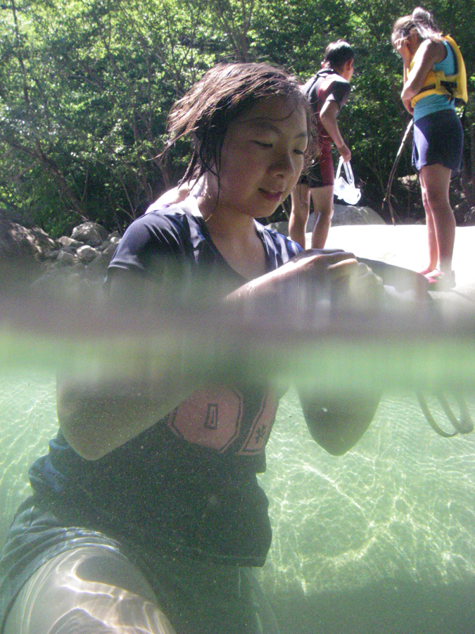 最初は山岡も液晶パネルを見ながら撮っていましたが、水面の小波のため、うまく半分水中半分水上で撮ることがなかなかできず、「ぎりぎり水中だけ」とか「ぎりぎり水上のみ」の写真を量産してしまいました。ノーファインダーでレンズのほうを確認しながら撮ったほうが何倍も成功率が高かったです。一度試してみてください。