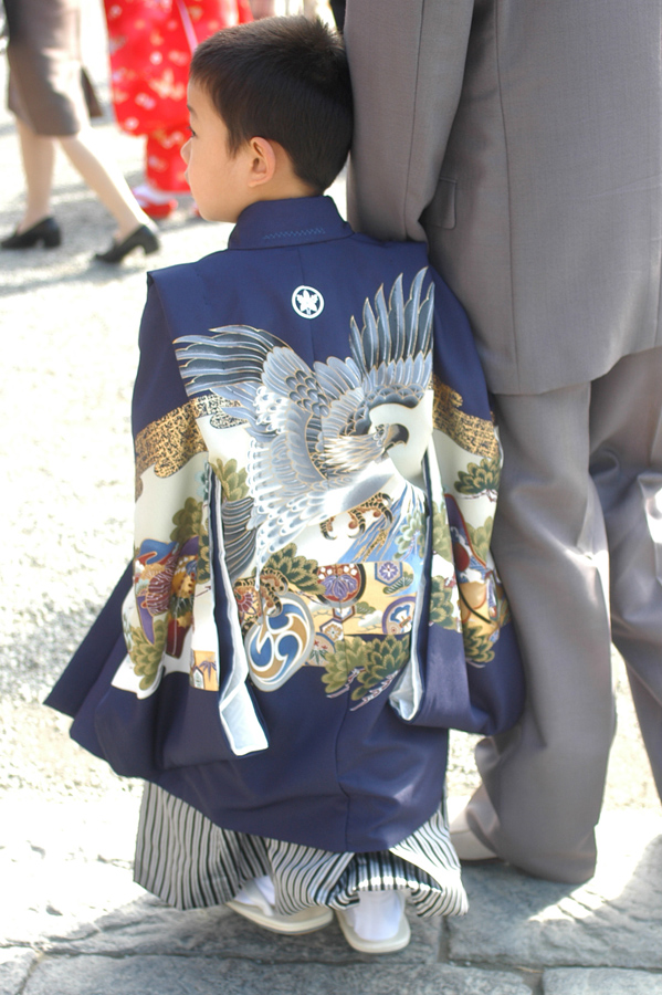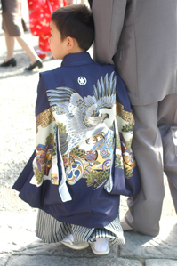 着物はたいてい後ろから見たときのビジュアルも計算してデザインされています。女の子の帯もそうですし、男の子の羽織も後ろに柄が入っているものが多く見られます。