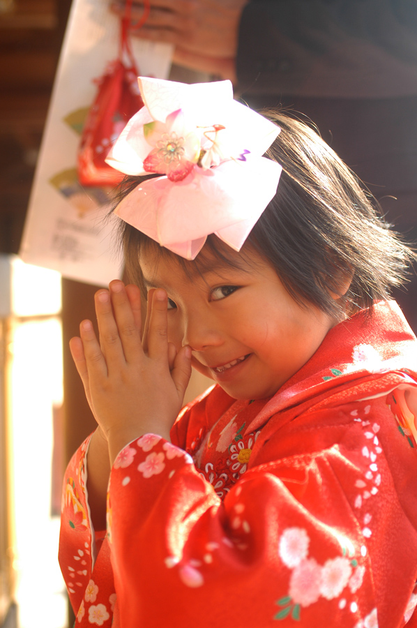 七五三は着物を着るだけで終わりではなく神社に詣でて子供の成長を祈る行事でもありますから、お参りしているところも撮っておきましょう。前から撮れるような状況ではないので横から撮ることになりますがこのときもできる限り逆光側から撮りましょう。緊張して手を合わせる様子もかわいいし、てれながらチラッとこちらを見た瞬間などもシャッターチャンスです、作例(3)。