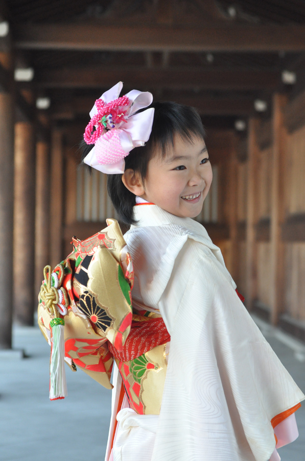 なるべくシンプルで子供から遠くにあるものを背景に選ぶのがコツです。ここでは参道脇の通路を縦に使って背景にしました。奥行きがあって背景が適度にボケるので子供が引き立ちます。この場合も背景に人が入らないように注意しましょう。撮影モードをAに設定して絞りを開放にして撮ると背景が大きくふわっとボケてくれます。