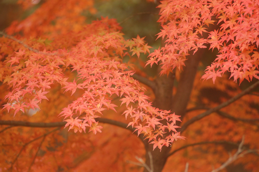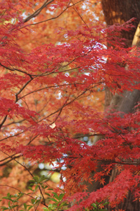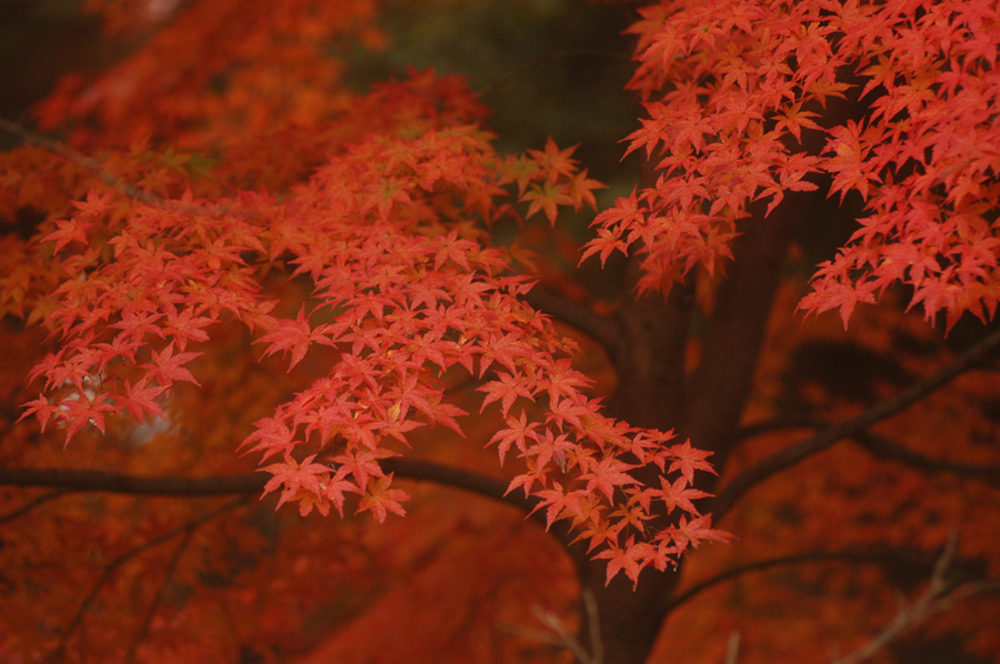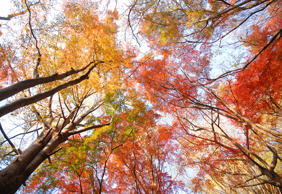 まずはロケーション選びです。きれいな紅葉がある場所を選ぶのはもちろんですが個人的には「アップダウンのある場所のほうが撮りやすい」というのが私の印象です。上下に動けるほうが下から見上げたり、上から撮ったりといろいろな角度から紅葉を撮る事ができるからです。紅葉は基本的に木の葉ですから、当然人の背丈よりも高い場所にあることがほとんどで平坦な場所でも下から見上げてなら撮ることならできます。しかし上から撮るには木より高い場所に移動しなければならず、平坦な場所では上から撮ることができません。アップダウンのある場所なら自分が高いところに登れば下にある木を上から撮ることもできるので、バリエーション豊かな写真を撮る事ができます。