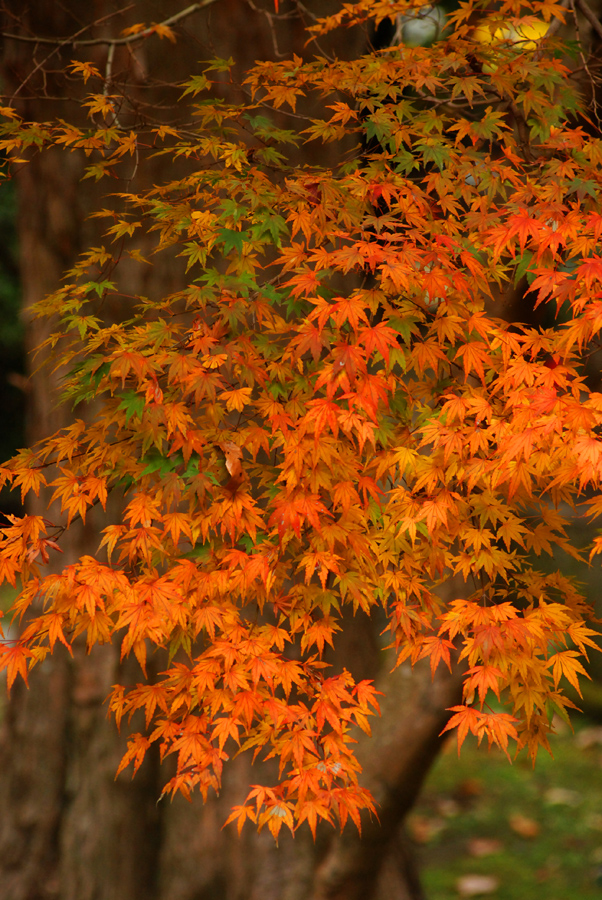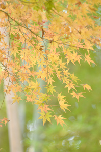 逆に作例(2)はこのフラットな光とプラス補正で明るくやわらかい印象にしてみました。この紅葉はあまり濃い色にならず、もともと淡い色の紅葉だったので、それを利用して背景を明るい緑(このときは竹林)でまとめて、+1補正して全体を明るくすることでこの淡い色のイメージを生かしてみました。