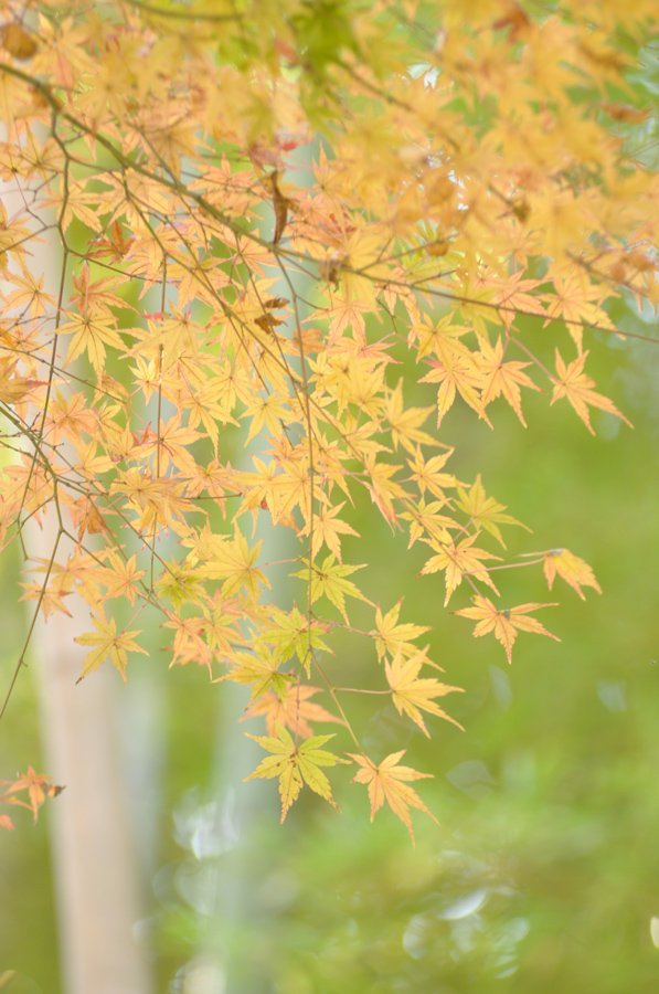 紅葉の下から見上げるような角度で撮ることで逆光に葉を透かすように撮りました。曇りの日ならどの方向から撮っても同じ光だと思いがちですが、曇りの日であってもやはり光は空からさしているわけですから見上げるように撮れば晴れの日ほどではないにしても逆光で撮ることになります。曇りの日の光はこういったやわらかいイメージの写真にも適しています。