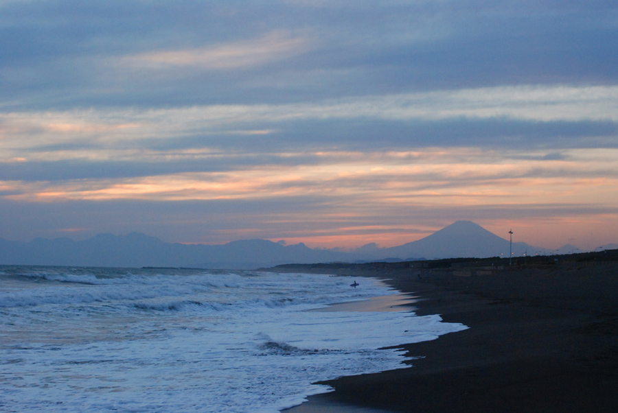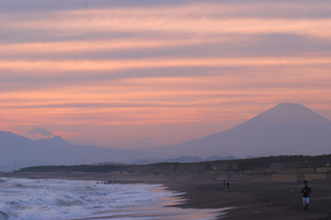 よくあるのが、上空に厚い雲が出ていて水平線や地平線に近い低いところだけが色づいている、という状況です。こんなときは空全体を撮るのではなく、きれいに色づいている部分だけを切り取ってみましょう。作例(1)を撮ったときはきれいに色づいているのがこの部分だけでした。作例(2)は同じ時にやや引いて撮った作例です。作例(2)のままでは夕焼けのインパクトが弱いので、80-200ミリの望遠ズームに付け替えて、富士山の稜線と色づいた雲の部分だけをアップにして撮ったのが作例(1)です。