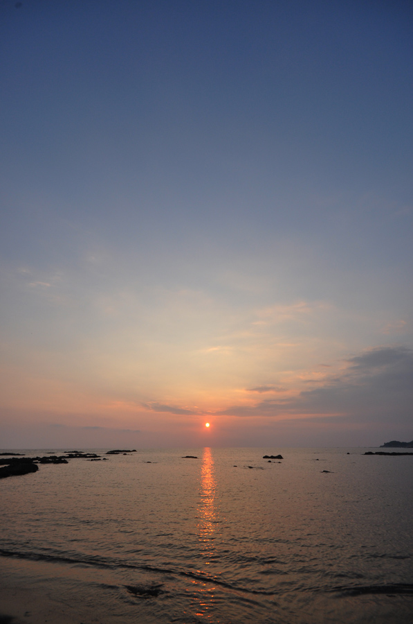 日によっては雲がほとんどない、という状況もあります。本来は青く暮れてきた空に赤い雲が浮かんでいれば雲を主役にフレーミングを決めるのが基本です。夕焼けは雲に夕日が当たって赤やオレンジ色に染まるのが一番いい状況なので、雲がないということは染まる媒体が何もないということになります。こんなときは空のグラデーションを撮るつもりで広角で空全体を撮ってみましょう。グラデーションを画面に納めるには、水平線や地平線に近い明るい部分から上空の暗い空の部分まで入れる必要があります。望遠レンズでは狭い部分しか撮れないので広角で全体を撮るようにしましょう。作例(3)では10ミリのレンズを使いました。