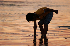 夕方はシルエットを撮る写真にも大変よい状況です。作例(4)は海辺で遊ぶ子供をシルエットにして撮りました。背景には夕暮れ色になっている部分を選び、シルエットの素材にするものは黒くつぶす感じで撮ります。作例では人物をシルエットにしていますが、人をシルエットにするときはなにか動作のある瞬間を狙うといいでしょう。棒立ちになっているところよりも動きのある写真が撮れます。きれいなシルエットにするためには人物にピントをしっかり合わせて撮りましょう。また、シルエットにする素材は人物でなくても木や植物、形に特徴のある人工物などでもいいと思います。