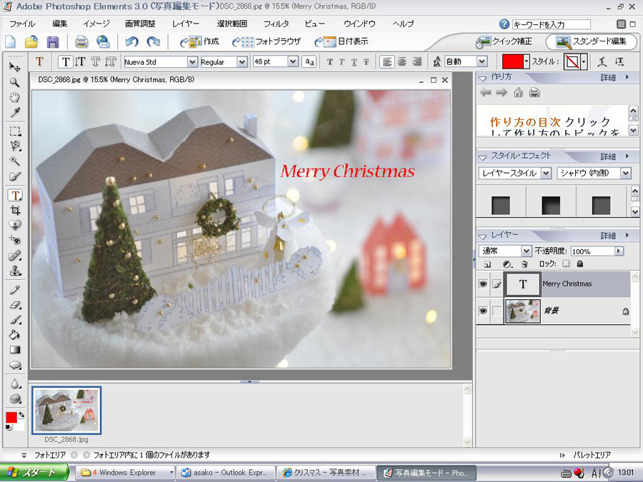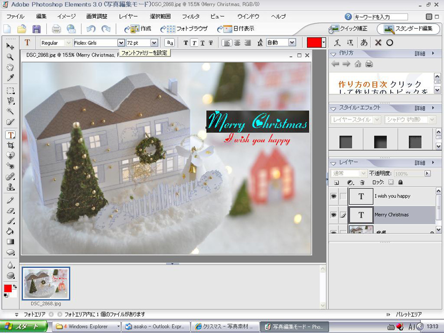 今回は自分が撮った写真をフォトショップエレメンツで加工してクリスマスカード用写真を作ってみましょう。