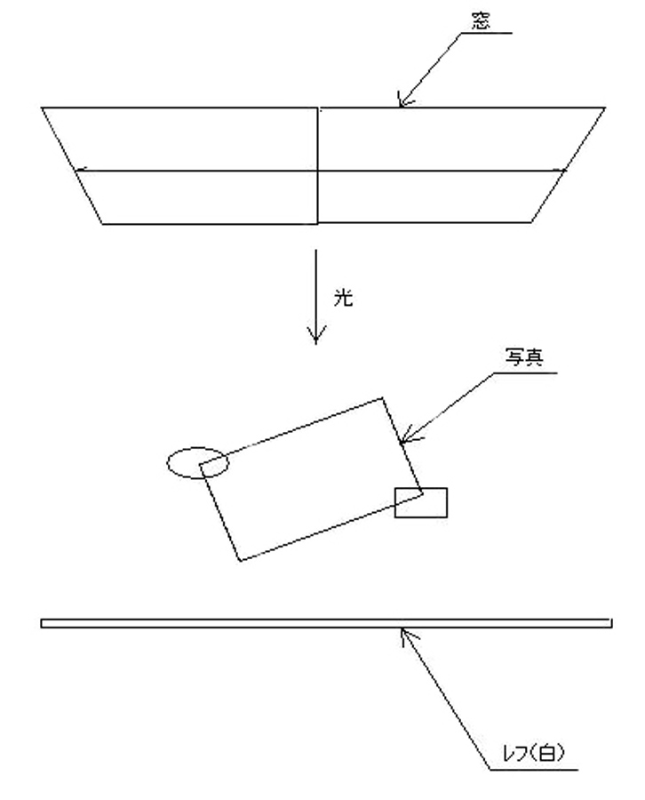 ライティングは図のような状態です。レフは大きいほうが効果があります。私が使ったのは70×50センチくらいの発泡スチロール板ですが、被写体が小さなL判のプリントですからA3くらいの紙でも大丈夫だと思います。そのかわり小さなレフ板を使うときは画面にギリギリ入らないくらいに近づけてください。あとはこの写真を使ってハガキにプリントすればOKです。先週紹介した「写真に文字を入れる」方法を使って文字を入れてもいいでしょう。その場合はあらかじめ文字を入れるスペースをあけて撮影しておくといいでしょう。