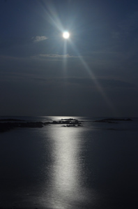 作例(1)は午前1時くらいに撮った写真です。当然空は真っ暗で「月が煌々と輝いている」状態です。この状態で地上の風景や空を取り入れて月の写真を撮ろうとすると、月が周りにくらべて明るすぎるため、月に露出をあわせると空や地上のトーンがつぶれて真っ暗になってしまいます。逆に地上の風景がつぶれないようにプラス補正すると月がトビトビになってしまいます。月の明るさと周りの明るさに差がありすぎてバランスよく写すのが難しい状態になってしまうのです。