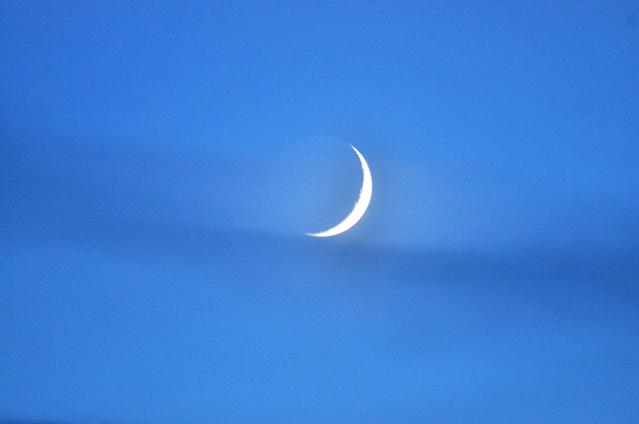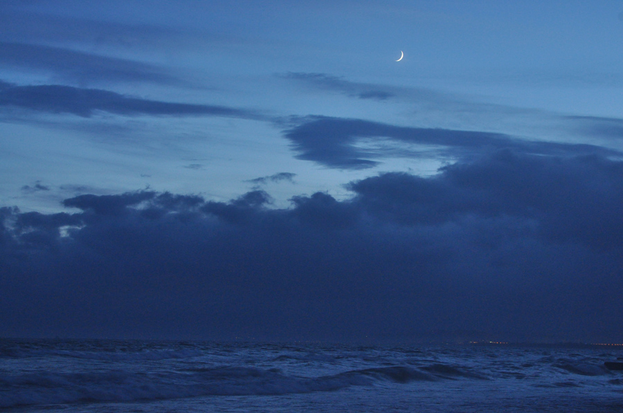 まず月がどのように動いているのかチェックしましょう。ネットで簡単に調べられますから、月の出と月没時間をチェックしましょう。また、あわせて日没時間と、日の出の時間も見ておきましょう。そしてどのようなタイミングをねらえばいいのか、というと日没後か日の出ちょっと前くらいの空が真っ暗にならず濃い青くらいの残照が残っている時間帯をねらいます。なおかつ月が低い位置にあるタイミングがベストです。つまり月が出たばかりか沈むちょっと前くらいでしょうか。私の場合は地元の潮見表を見て日没と月の出がほぼ一致するタイミングがあるときは「今日は月が撮れる」ことを想定して撮影に行きます。