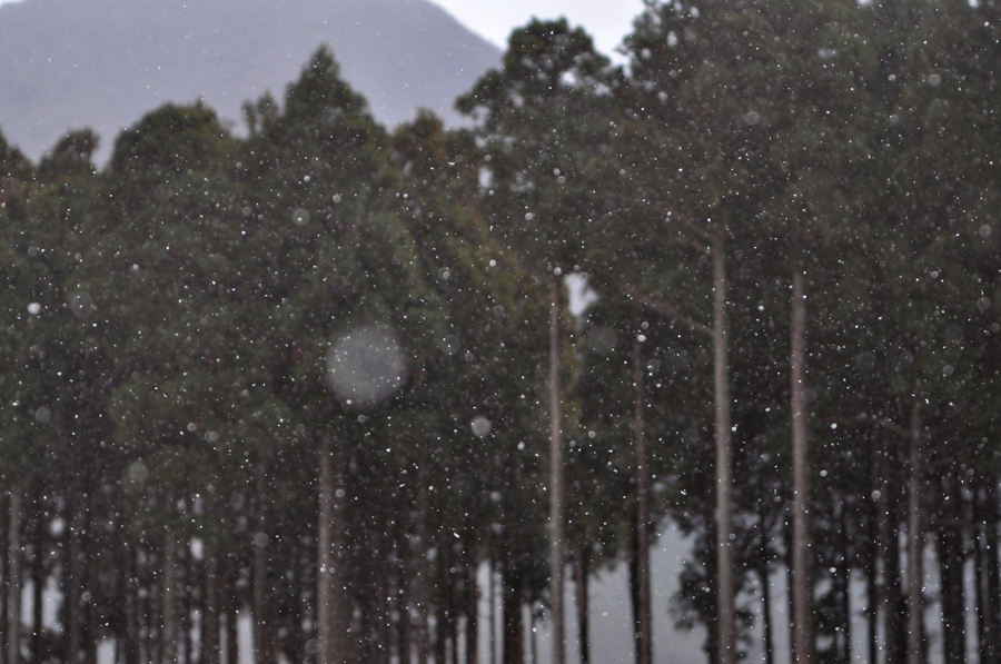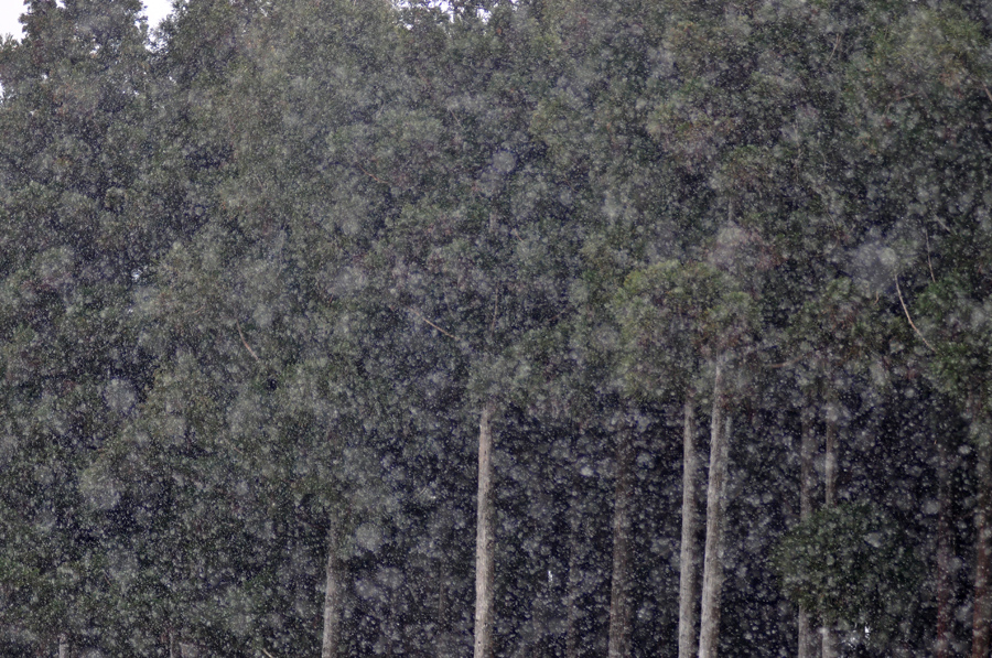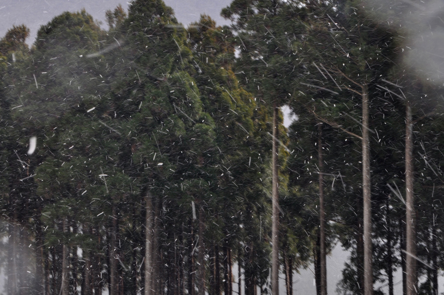 降っている雪をふわっとした感じにするにはこれでOKです。さらに背景ですが、できれば背景がボケていながらもなんであるかわかる程度にしておくと写真全体のバランスがよくなります。他の作例はズームの100ミリ付近を使っていますが作例(4)は70ミリ付近を使いました。この場合はこれくらいの画角にしておくと杉林が背景になっていることがわかります。
