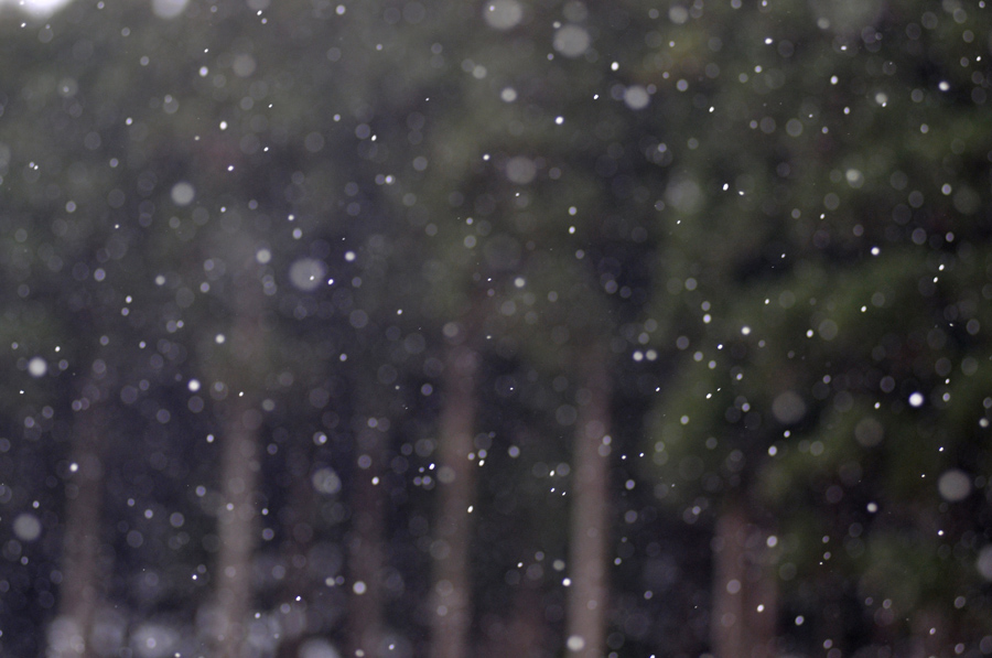 降っている雪は上から落ちてくるものですし、風にあおられて吹き流されることもあるので動く被写体となります。まずはこの動きを止めて写すか、流すのかによってだいぶイメージが変わります。作例(1)はシャッター速度1/20で撮っています。これくらいのシャッター速度だと雪が風にあおられている様子がわかります。冷たい風を連想させて寒さを表現するにはよいと思いますが、「幻想的」という感じにまとめるのは難しい状態です。まずは高速シャッターを使って雪を止めるように撮ってみましょう。また、降る雪は以前お話した雨(【Vol.014】降り注ぐ雨を細い針のように撮ってみよう)と同様くらい背景でないとうまく写らないので背景に暗い色や実際に暗い場所を配して撮りましょう。