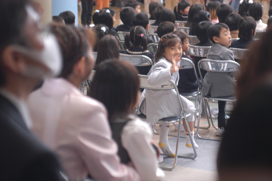 入学式は卒業式と違って一人づつ壇上にあがることもなく子供たちはほとんど席に座ったまま先生方のお話を聞くだけなのでビジュアル的にはあまり変化がなく正直写真に撮るようなシャッターチャンスはあまりありません。このときは後ろの保護者席で念のためカメラをもってスタンバイしていたところ、子供がこちらを振り返ったので、その様子を撮りました[作例(3)]。着席したところを撮りたいなら式典が始まる前に撮ってしまうほうが撮りやすいと思います。
