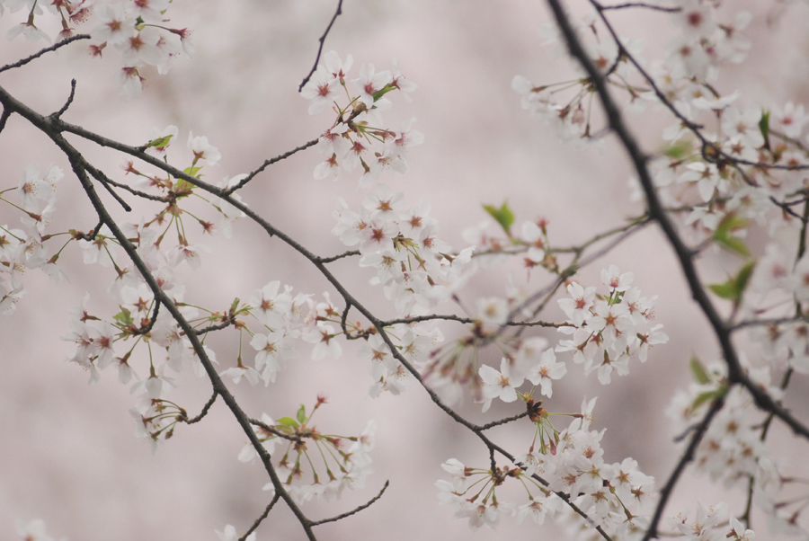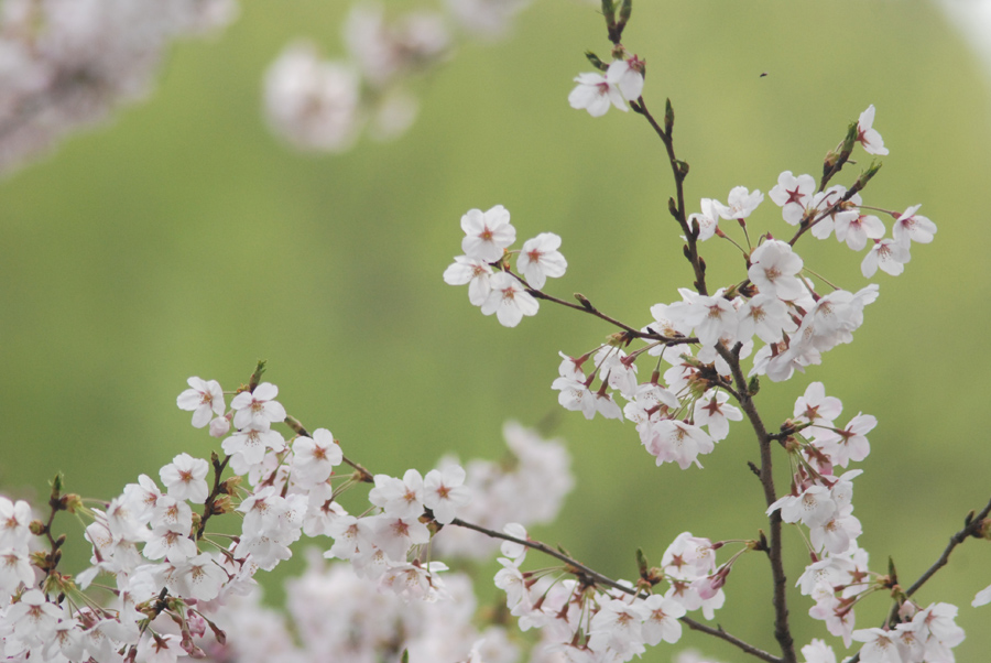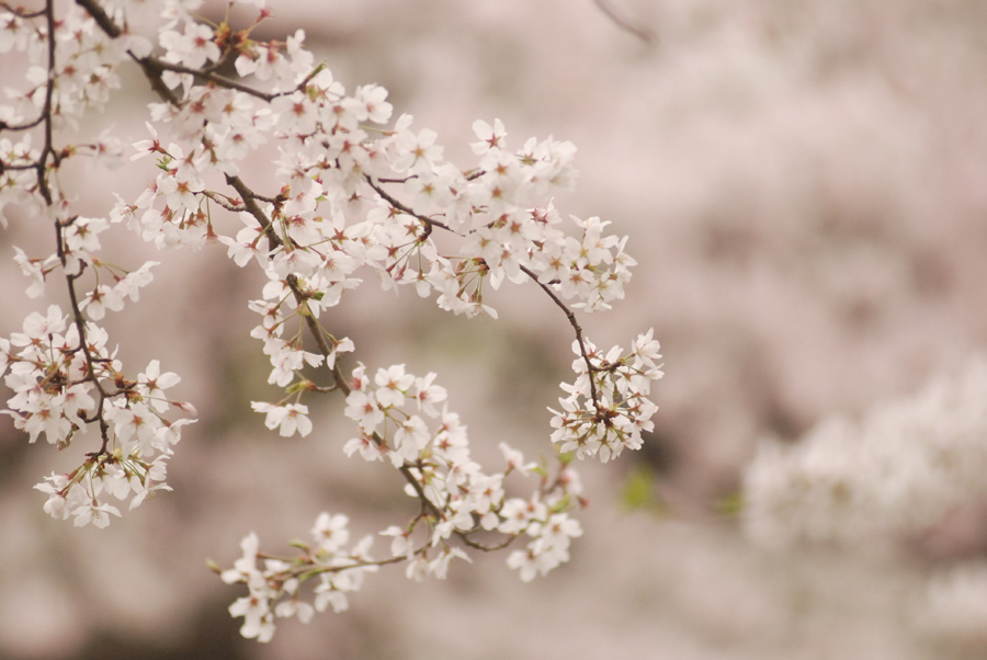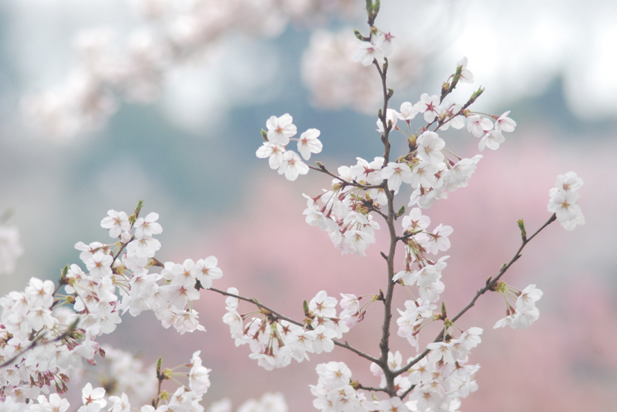 私は普段WB(ホワイトバランス)は太陽光を基本として使っています。WBを太陽光に設定しているということは、晴天の太陽光(白色光)で自然な発色になるようになっているいうことです。つまり、夕方のオレンジ色っぽい光ではオレンジ色っぽく、日陰では青っぽく写るということになります。曇りの日はそのときの雲の厚さなどにもよりますが、全体に青っぽく写る傾向があります。こんなときWBを曇天にセットすると、青みを消して温かみのある色にすることができます。本来は曇りの日の青カブリを相殺して白いものを白く写すためのWBの設定です。しかし今回は見た目よりもやや赤みの強い色調にすることで桜の薄紅色のイメージを強調してみました。