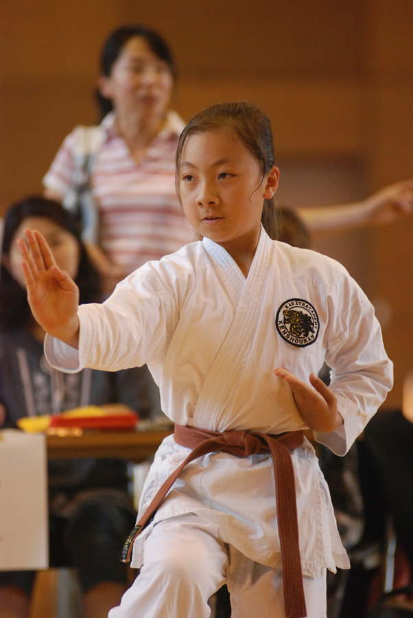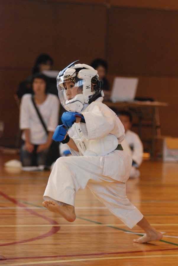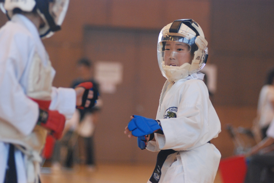 敵と向き合って戦う格闘技スポーツなどでは、撮りたい選手(子供)の顔が見えるほうから撮るのが基本です。このとき、敵の後姿を少しでも画面に入れて撮ると臨場感が出ます。この場合敵の後姿は脇役ですからはみ出していてもいっこうにかまいませんし、ボケていても写っていればいいのです。作例(3)は青のほうが撮りたい子供なので、青の正面になるほうからカメラを構えて準備していました。あえて中央ではなく右よりのAFフレームを選択して、画面左側に空間を作ります。そして選択した右よりのAFフレームに子供を合わせて、敵の後姿を入れるように撮りました。ためしに左側の敵選手の後姿を隠して写真を見てみてください。この後姿があるのとないのとでは写真全体の緊迫感がまったく違うのがわかると思います。