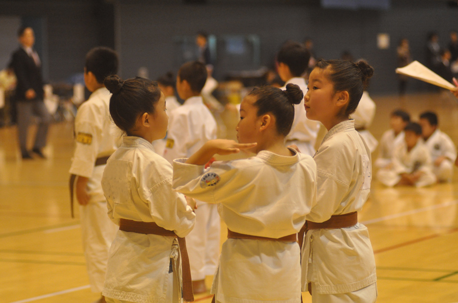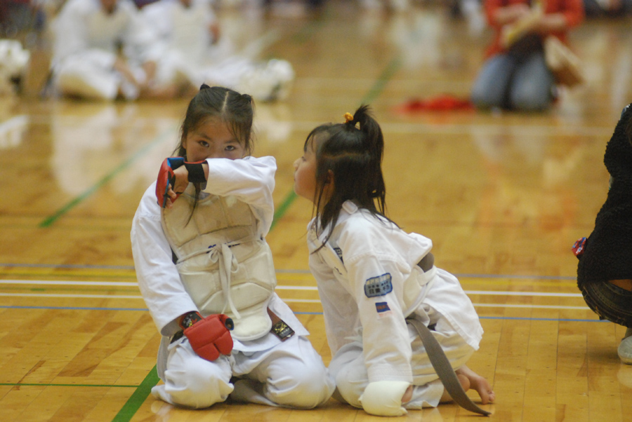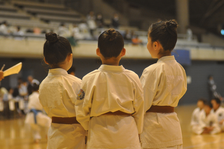 作例(3)と作例(4)は団体戦に出る女の子3人が髪型もお揃いできめているところを後ろから撮りました。同じ位置から、同じようなフレーミングで撮っていますが、作例(3)は立ったままカメラを構えて撮った写真で、作例(4)はしゃがんで低い位置からとっています。