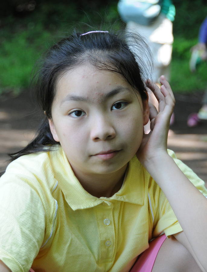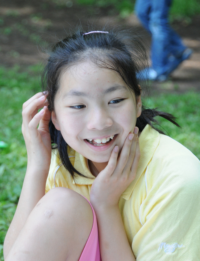 作例(1)では口元からあごのあたりと目のくぼみ部分などに陰ができてしまっています。しかし銀色のレジャーシートに座っていると下から光が反射するので、この目ざわりな陰が消えて肌の質感もきれいに出ます。特にこの効果が大きいのが日陰にいるときです。お昼の場所として確保するのは大抵日陰ですからちょうどいい具合でスナップを撮る事ができます。銀色レジャーシートはわざわざ購入したほうがいい、と言うほどのものではないのですが、次に買い換えるという時には銀色をお勧めします。