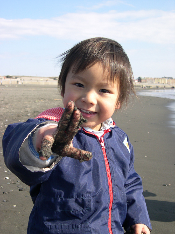 遊びに行った先で子供のスナップを撮るとき、「ちょっと見せて」の一言は非常に便利です。泥遊びでドロドロになった手を見せてもらってもいいですし、摘んだお花や拾った貝殻や石ころでもいいのです。「見せて」から、「どこで取ったの?」とか「きれいだねえ」と話をつなげると子供たちも喜んで見せてくれます。