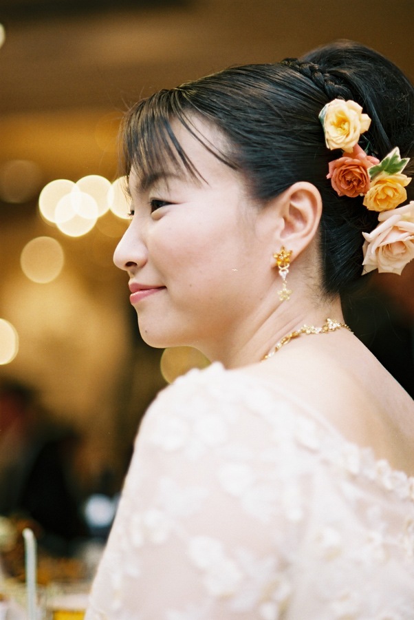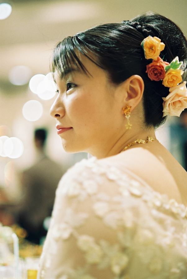 作例(5)はノーストロボで撮りました。作例(4)と同じ新婦を同じようなアングルから撮っています。それでも光の具合だけで写真の印象がまったく違うのがわかると思います。作例(4)は新婦がストロボの光で明るくなっているのにあわせて露出が決まっているので背景が暗く落ちています。一方作例(5)はその場の照明だけで撮っているので背景が明るく、逆光気味の光で撮ることになりました。肌の質感などはこちらのほうがきれいに撮れています。式場の照明にもよりますがその場の光を生かして撮るのも一つの方法です。