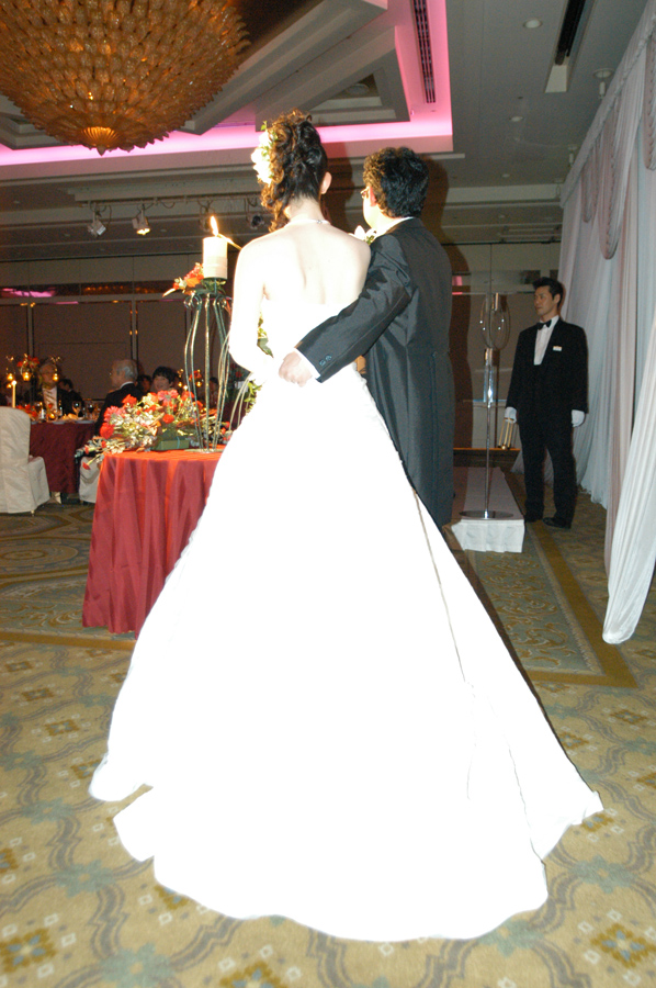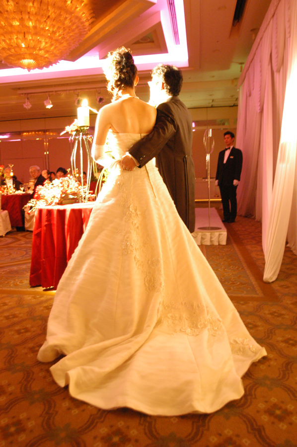 結婚式に限らず、人物の写真を撮る時は顔が写るように撮るのが普通です。もちろん普通のスナップも撮った上でですが、後姿も撮っておくと写真を組むときに変化がつけられます。ここではキャンドルサービスのため入場した新郎新婦を後ろから撮ってみました。キャンドルサービスの時は衣装がドレスになっていることが多いので後ろに長くひいたドレスが全部入るようにフレーミングします[作例(1)]。大抵はスポットライトで新郎新婦が照らされているのでその逆光を利用して撮りました。ストロボを使うとドレスの質感が台無しになってしまうので[作例(2)]、ISO感度を高くしてなるべくその場の光を生かしましょう。