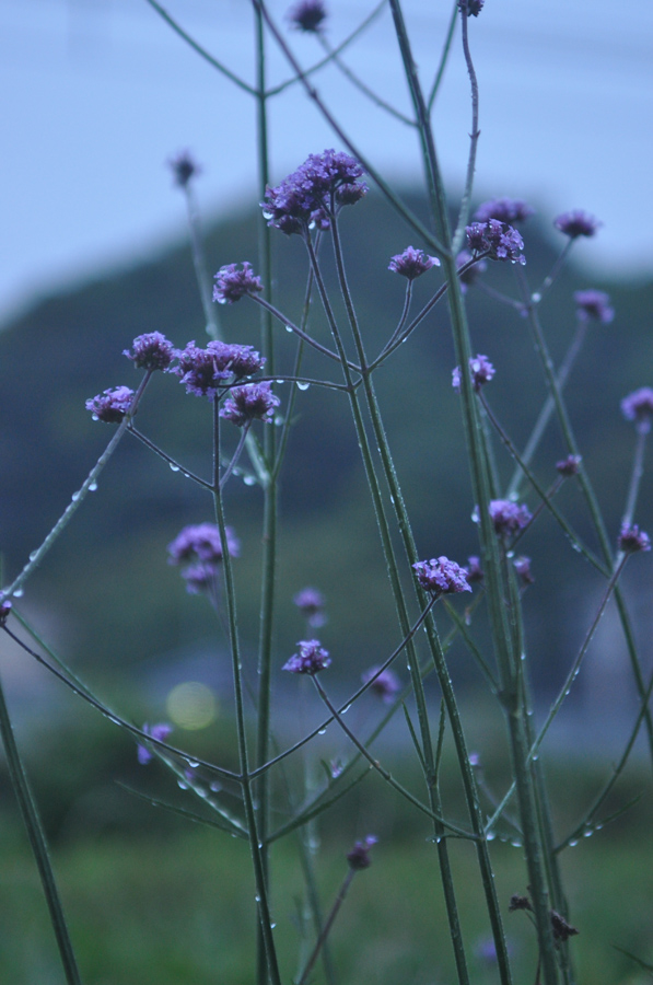 昨年、雨粒は暗い背景でないと写らないということを説明しました。雨の雫を撮る時も同じです。作例(1)では線路際の土手に咲いていた野草(というか雑草)が雨の雫をまとっているところを撮りました。雨天の夕暮れ時のイメージをだしたかったので、-0.7の露出補正をして暗めに撮りました。雨の雫も明るい背景で撮るより、暗い背景で撮ったほうが目立ちます。暗い背景のうえにきらっと光るようにとることができます。何しろ水の雫ですから小さいので目立つように背景を選ばないと存在感がだせません。ここでは線路の向こうの小高い山を背景にして雫が目立つように撮りました。