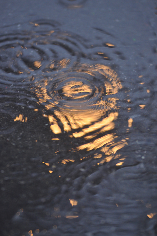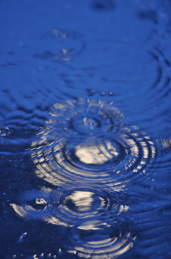 作例(2)は水溜りに雨が振ってできた波紋を撮ってみました。これも夕暮れ時だったのですでに暗くなって街燈が点いていました。その街燈の反射が水溜りにうつるアングルを探して撮りました。水面の波紋はその水面にトーンに変化のある映り込みがないとはっきり写りません。要するに一色だけのべたっとした映り込みしかない水面では波紋はよく見えないのです。街燈が映りこむポイントを狙ったのはそのためです。このときのホワイトバランスはAでした。このままではほとんど街燈の黄色い反射だけしか色がないので色味がさびしい、と感じました。そこでホワイトバランスをタングステンに設定して撮ってみました[作例(3)]。こうすると全体が青くなるので、先ほどのアスファルトのグレーだけの写真よりも雰囲気のあるイメージになります。青は水とは相性のよい色なので、水の写真になら大抵は違和感のない仕上がりにすることができます。
