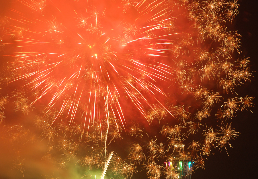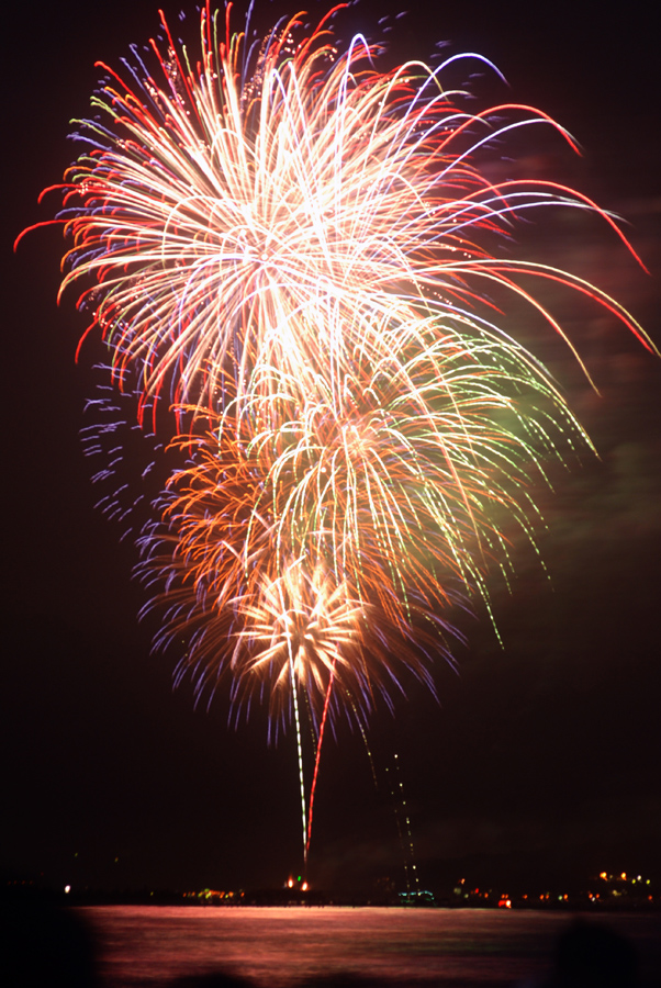 最初に花火の写真を撮ったとき、一番「困った」と思ったことが、花火は打ちあがってみないとどの程度の高さ、どの程度の大きさなのかが予想できないということでした。最初からフレーミングを決めてしまうと半分切れてしまったり、上下に無駄な空間がボコっと空いてしまい間抜けなフレーミングになってしまうという失敗が山のようにありました。そこで私が現在やっているのは打ちあがった玉をファインダーで確認しながら追いかける、と言う方法です。三脚にがっちりとめてしまったらそんなことは出来ませんから、上下のパン棒だけちょっと緩めておくのです。このときファインダーで玉を追いながらピントあわせもしてしまいます。そして玉が最高点まで来たと思ったらすばやくパン棒を占めてカメラを固定し、同時にシャッターを切ります。すると花火が開くところをちょうどよいフレーミングで捕らえることが出来るというわけです[作例(1)]。ちょっと忙しいですが今のところ私はもっぱらこの方法で撮っています。