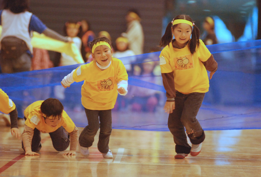 作例(1)は観覧席ではなくフロアから撮っていますが端っこにでよいので球を入れるカゴを入れてフレーミングすると玉入れだということがわかりやすいでしょう。また、もし「近くから撮りたい」と思う場合はあらかじめ記録係や広報担当に立候補しておくという手もあります。もっともそういう場合は自分の子だけでなく皆をまんべんなく撮ってあげましょうね。