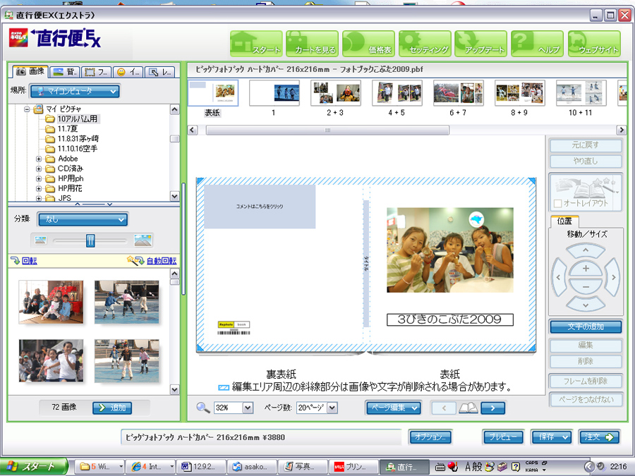 さて、一年に一度くらいプリントを作りましょう。私は今はPCでキタムラのビッグフォトブックを使ってフォトブックを作っています。ハードカバーにして実家の母の誕生日に毎年孫の一年間のフォトブックを作ってプレゼントしているので、母の誕生日近くになると「あーそうだ、やらなきゃ」とPCに向かいます。私は自由にレイアウトできるフリーレイアウトで作っています[作例(2)]。