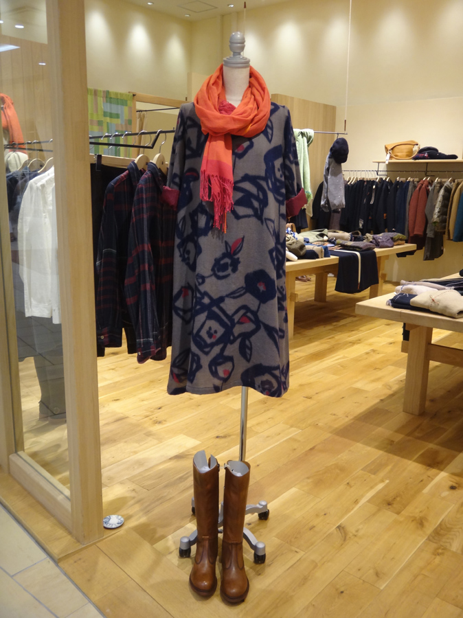 まずはアクセントになる色を探します。ショップの入り口にあったディスプレイにちょうどよいものが見つかりました。赤いマフラーをアクセントにして撮ってみたのが作例(4)です。同じフレーミングでPモードで撮ったのが作例(5)です。