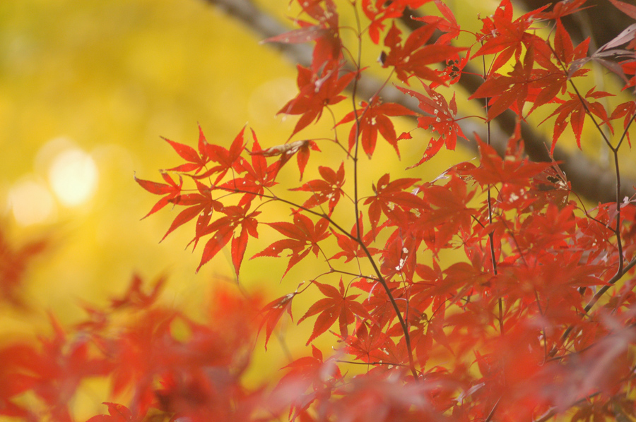 作例(1)はあえて主役の赤と違う色の黄色を背景にしました。別に同じカエデの赤を使ってもおかしくはありません。一本の木の一部の枝を主役に、同じ木のほかの枝を背景にする方法だってもちろんありです。わざわざ主役と違う色を背景に選んだのはそのほうが派手めの印象になるからです。この作例(1)の場合のポイントは背景に入れるものに十分光が当たっていて、主役と同じか主役よりも明るい状態のものを選ぶ、と言うことです。もう一点は背景が遠くにあることです。主役より1メートル後方のものか、10メートル以上後方のものかでは背景となったときのボケ具合がまったく違います。あとは白い空の部分は極力画面に入れないように上手に切ってください。白い空はどう撮ってもなかなか絵になるものではないので、画面に入れないほうが無難です。