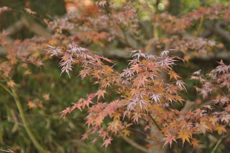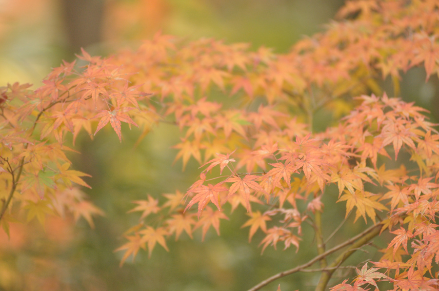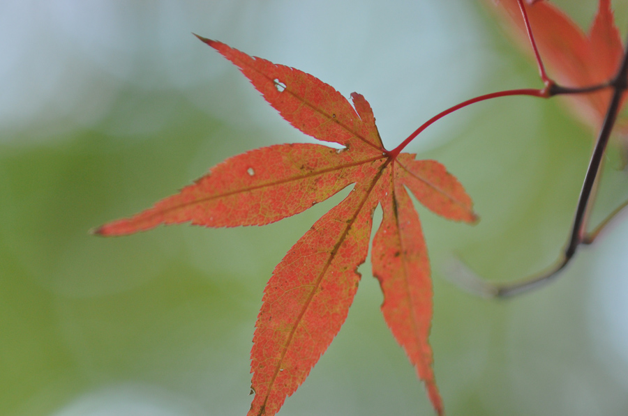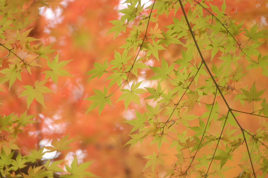 同じ木でも紅葉は上のほうの枝から順番に進む傾向があります。これはその木の種類やその木の生活環境にもよるのですが、大体上のほうから色づいていて最後に下のほうが紅葉する場合が多いです。そのためちょっと早く行き過ぎると、上のほうは紅葉していても下のほうはまだ緑色なまま、という状態もありえます。こんなときでも緑色の葉の背景に紅葉した部分を入れると、秋らしいイメージに撮る事ができます。[作例(3)]