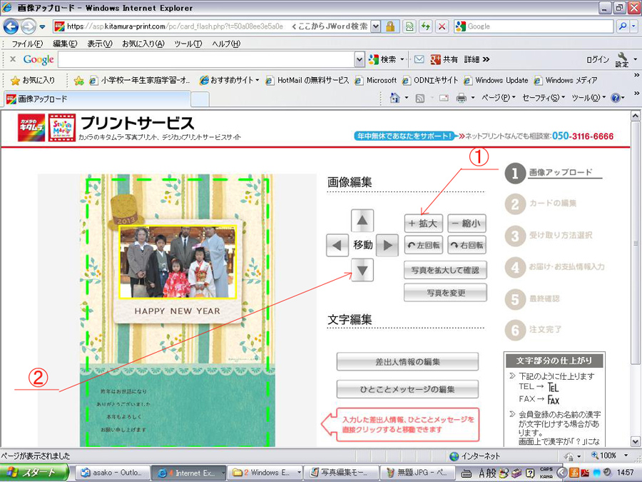 選択したデザインに写真を入れてみます[作例(2)]。ここで「完成」としてしまうと顔が小さいままになってしまうのではないかと思います。普通写真をプリントするときはL版でプリントする人がほとんどではないかと思います。作例(1)のように全身が入っている集合写真の場合、L版でなら顔もわかるくらいの大きさになりますが、今回のデザインのようにハガキの1/4ほどの大きさで見る場合、全身が入った集合写真だと顔が小さくなりすぎてしまいます。そこでパソコン画面右部分の画像編集を使って写真の大きさや位置を調整してみましょう。